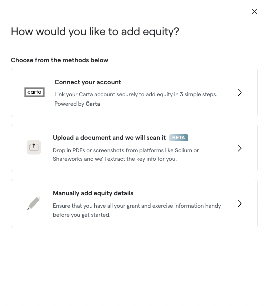 If this is the first time you are adding equity for a company, you can start by selecting how you would like to add your equity information.