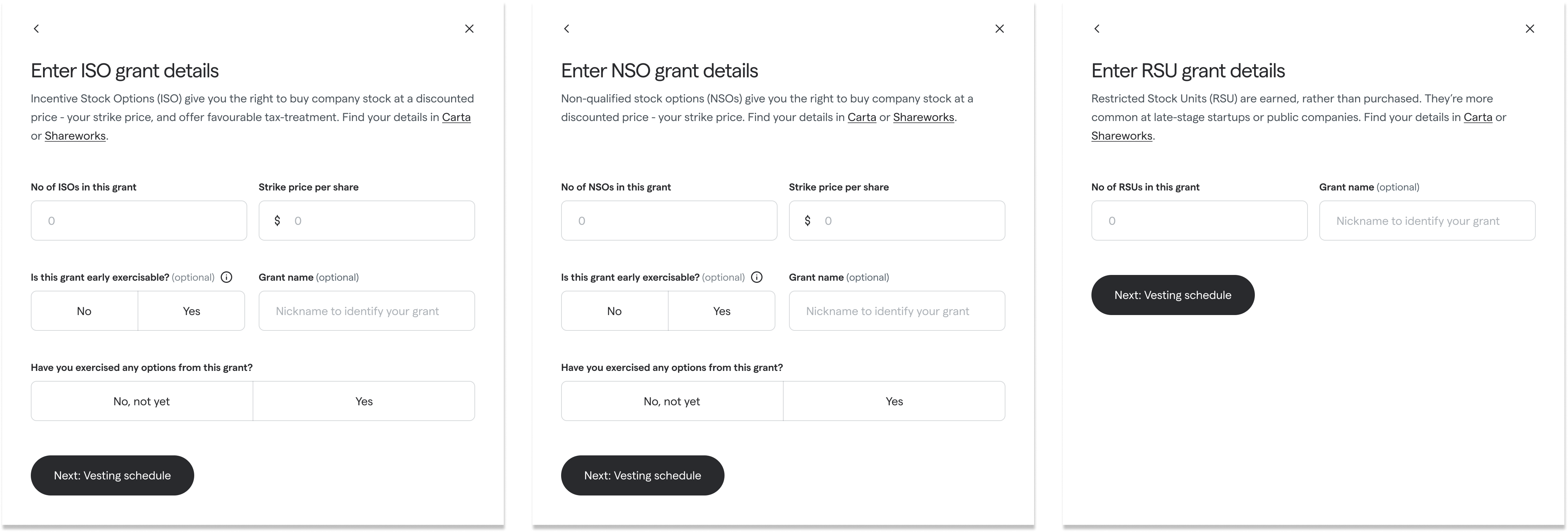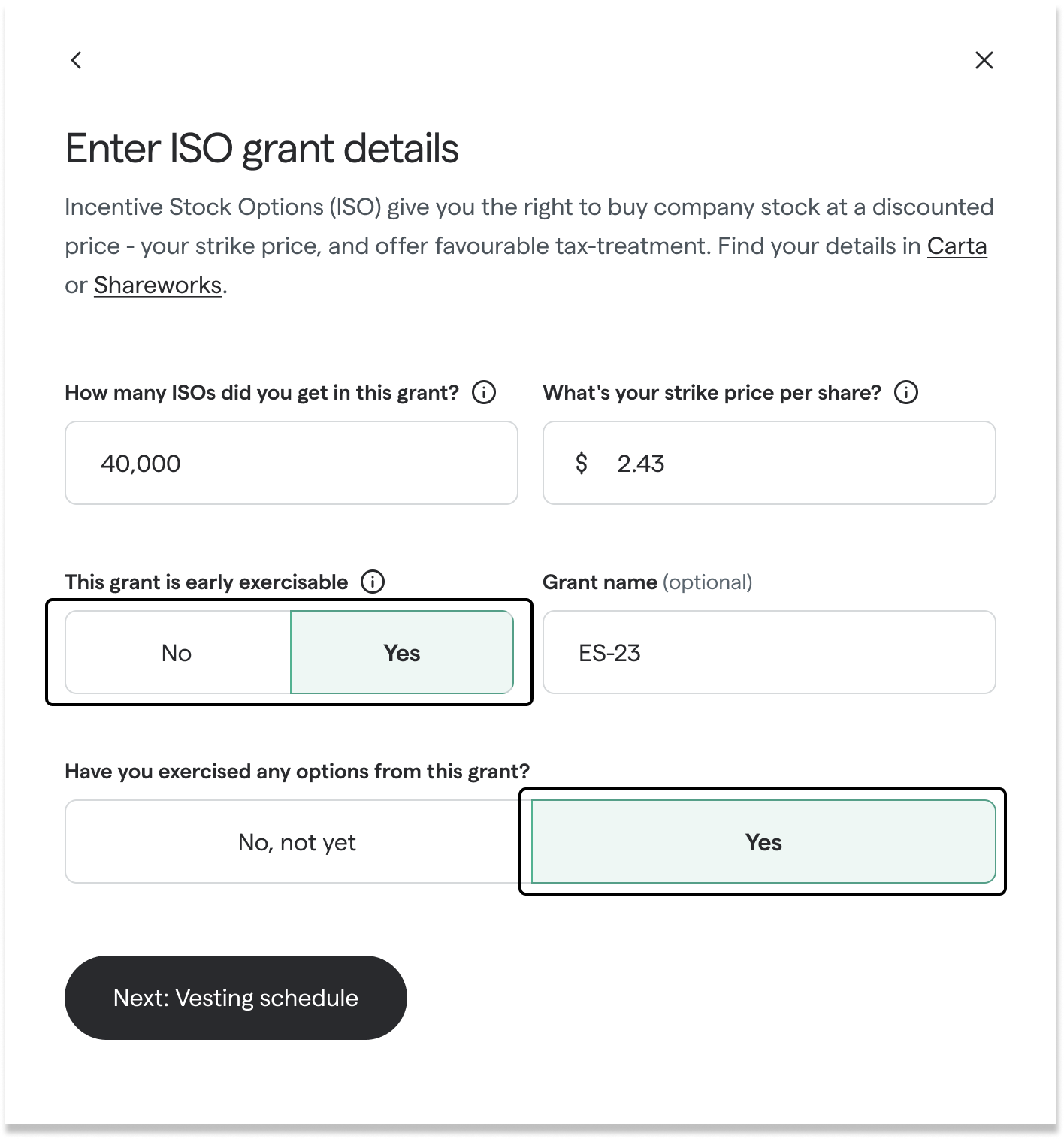 Please make sure to enter the total number of ISOs, NSOs, or RSUs issued in the grant. Once you have entered the vesting information, we will calculate the number of vested stocks for you.If you have exercised any vested ISOs or NSOs from this grant, make sure you answer 'Yes' to 'Have you exercised any options from this grant'. This will help us ensure that we calculate all your taxes and exercise costs correctly.