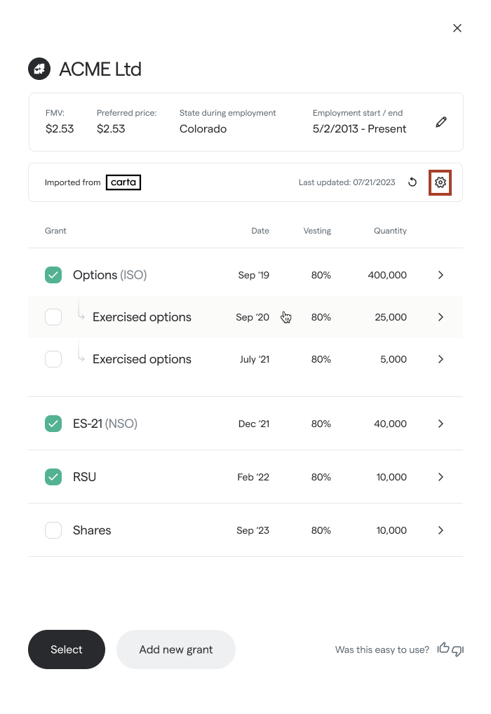 1. Go to the grants section of for a company that had it's information imported from Carta