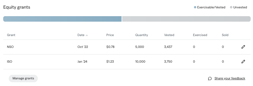 1. Once you are logged into Secfi, click "Equity". From there, you'll see the companies you've added equity for listed in the left hand menu or below the equity breakdown. Click into the company equity you're looking to update.
