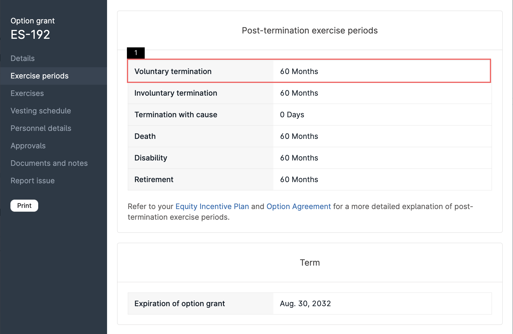 1. Post termination exercise period: The period mentioned for "Voluntary Termination" indicates how long after leaving the company you can continue to exercise your vested options. In the example above, the user can exercise their options anytime up to 60 months after leaving the company.
