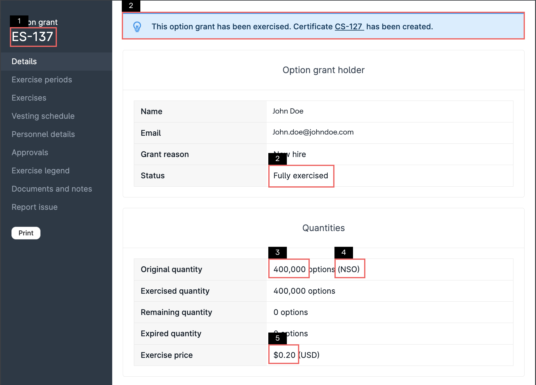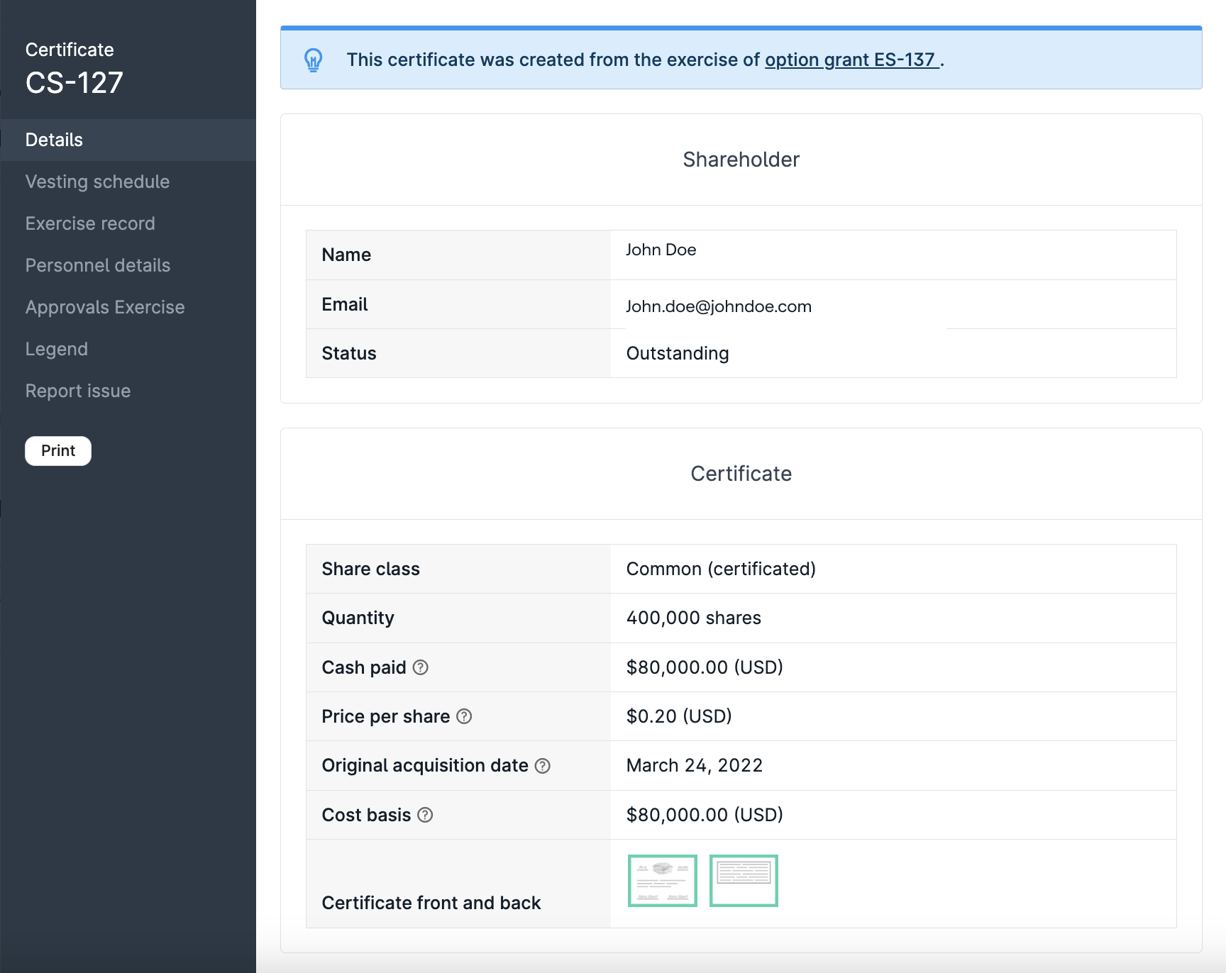 2. Exercised options: If you have been issued an option grant (ISO or NSO) and you have exercised it, you will see a banner that links to your share certificate. Under the "Option grant holder" section, your "Status" will also show your option exercise status. The table below maps out the values and their meanings.