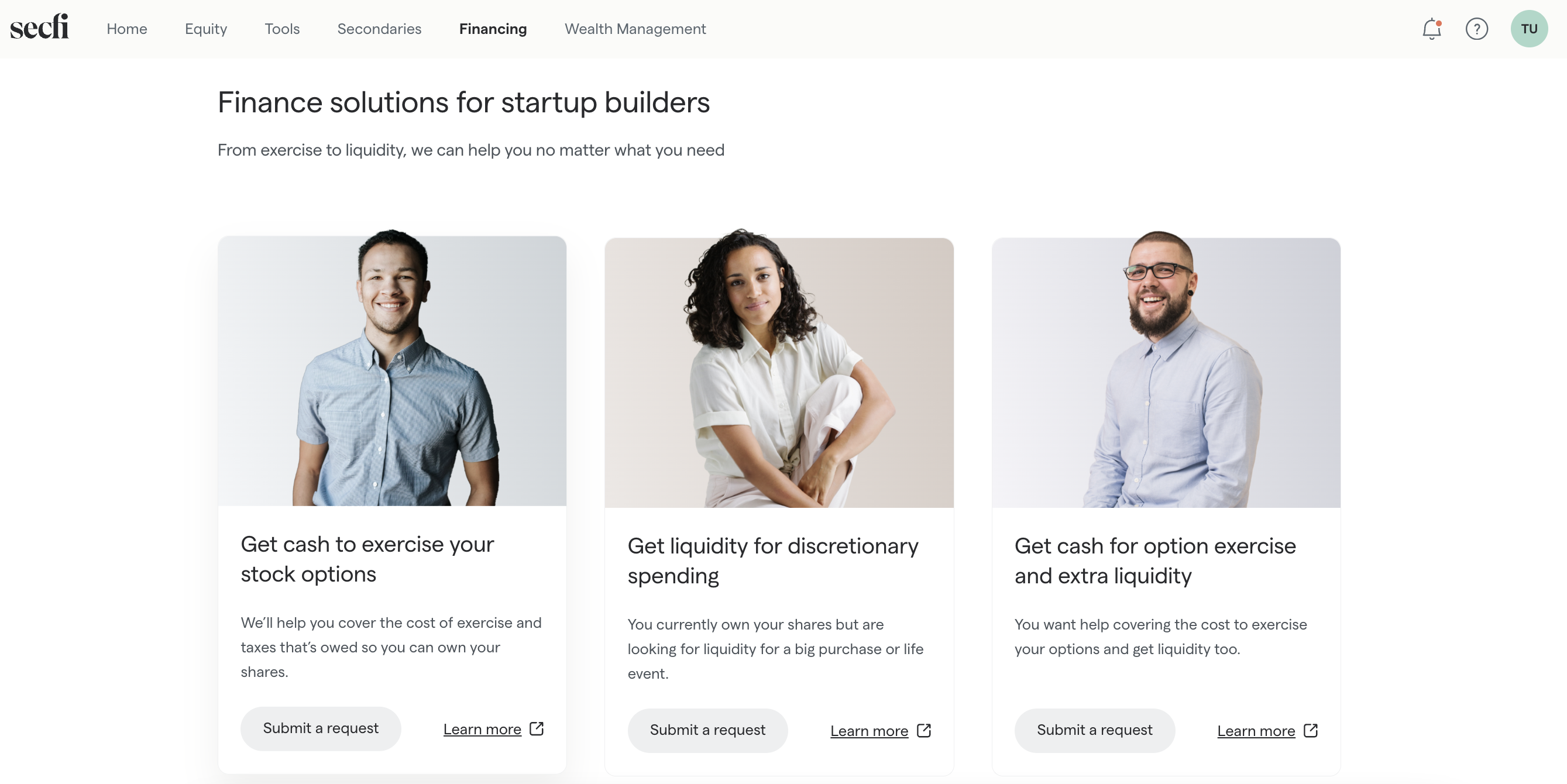 You can request financing by logging into your Secfi account and navigating to Financing in the top menu. Once in the Financing area, select 'Submit a request'.