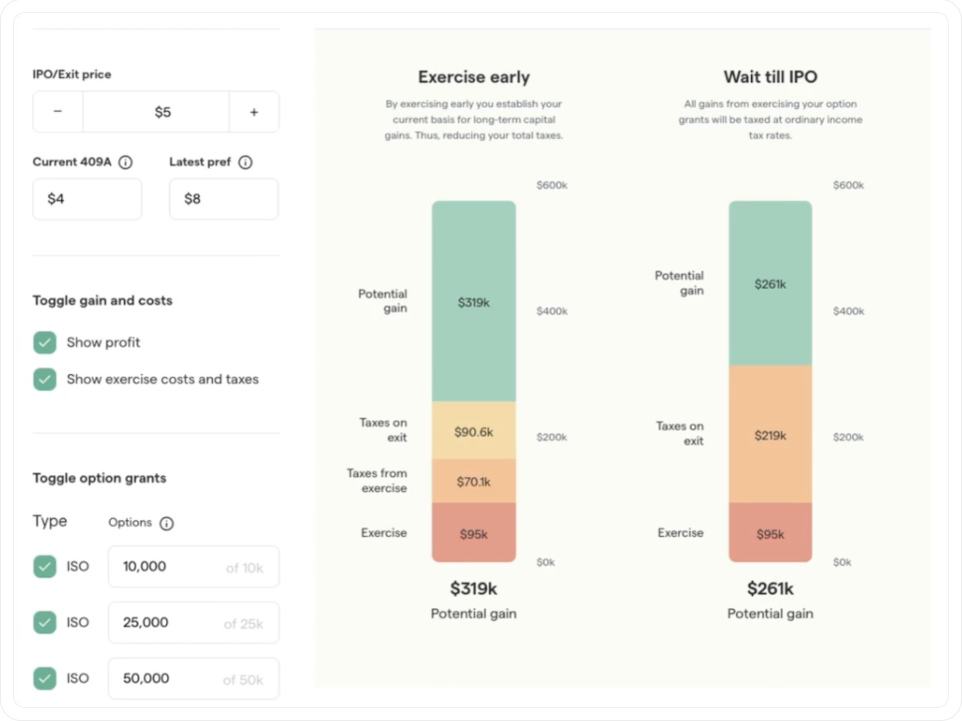 Plan ahead by modeling potential future gains. Adjust your company's exit value and see how your exercise and tax costs change vs your potential gains.